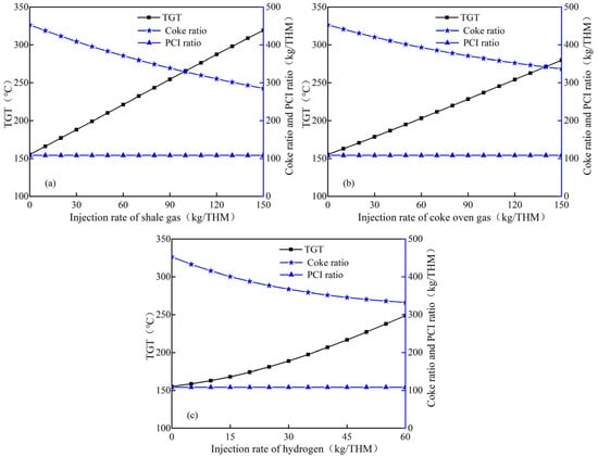 Figure 4 shows the variations of top gas temperature (TGT) and coke ratio after injecting hydrogen–rich gas with fixed PCI (108 kg/THM). It can be found that the initial TGT is 155.1 °C when only pulverized coal is injected. With the increase in hydrogen–rich gases injection quantity, the TGT shows an upward trend, while the increasing rate of the TGT is different with injecting different hydrogen–rich gases. As shown in Figure 4a, the increasing rate of TGT is about 1.1 °C/kg as shale gas injection quantity increases, while it is 0.8~0.9 °C/kg with coke oven gas injection (Figure 4b). This means that the injection of both hydrogen–rich gases can steadily increase the TGT. However, Figure 4c shows that the increase rate of the TGT with pure hydrogen injection varies from 0.7 to 2.2 °C/kg, which is not as stable as the injection of the other two hydrogen–rich gases. This may be caused by the increase in heat income per ton of iron in the blast furnace, which is due to the rapid decline in the substitution capacity of unit hydrogen injection quantity for coke.