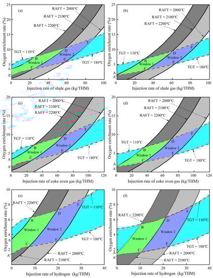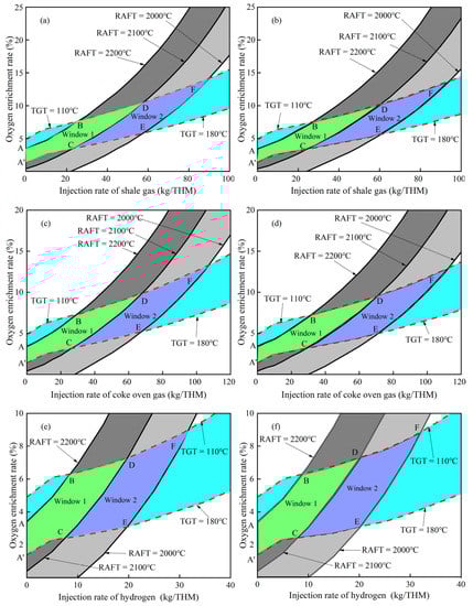 Figure 5 shows the calculated operating window for three hydrogen–rich gases at two blast temperatures (at constant preheating temperature of hydrogen–rich gases of 25 °C). The constraint ranges of the TGT and RAFT are 110~180 °C and 2000~2200 °C, respectively. The difference between window 1 and window 2 is the constraint range on RAFT: window 1 is 2100~2200 °C and window 2 is 2000~2100 °C. It can be found that all the operating windows for three hydrogen–rich gases shift to the lower right with the increase in blast temperature, while the shape and area of the operation window have not changed significantly. This indicates that increasing blast temperature at the same injection rate is beneficial to reduce the upper and lower limits of oxygen enrichment rate, while the relative adjustment range of oxygen enrichment rate and injection rate will not change. As the blast temperature increases from 1100 °C to 1200 °C, the injection rate ranges of shale gas, coke oven gas, and hydrogen in their respective integrated operating windows (the constraint range of the RAFT is 2000~2200 °C) change from 0~90 kg/THM, 0~107.2 kg/THM, 0~31.8 kg/THM to 0~90.4 kg/THM, 0~108.3 kg/THM, 0~32.9 kg/THM, respectively, while the oxygen enrichment rates corresponding to their maximum injection rate change from 14.2%, 13.3%, 9% to 12.9%, 12.1%, 8%, respectively. When the injection rate of shale gas, coke oven gas, and hydrogen is 20 kg/THM, the oxygen enrichment rate ranges corresponding to their injection rate change from 3.3~7.2%, 2.9~6.8%, 3.1~7.3% to 2.4~6.1%, 2~5.7%, 2.2~6.2%, respectively. It shows that the increase in blast temperature can slightly increase the injection rate range of the operating window, but can reduce the oxygen enrichment rate of hydrogen–rich gases. In addition, it can be seen from Figure 5 that the calculated operating window for hydrogen injection has the smallest variation range for blast injection rate and oxygen enrichment rate compared with the other two hydrogen–rich gases. This means that injecting hydrogen has the lowest fault tolerance and more stringent operation requirements.