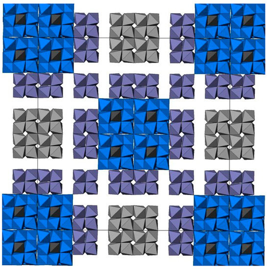 Combination of murataite 3C (blue)–pyrochlore (gray) modules and pyrochlore-type blocks (violet) in the structure of murataite 8C polysome.