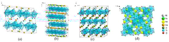 CaZr1−x(Ce/U/Th/Pu)4+xTi2O7 (x = 0.1–0.6) phases are represented by zirconolite 2M, 4M and/or pyrochlore (Table 3), and their structures shown in Figure 3, with data from [104].