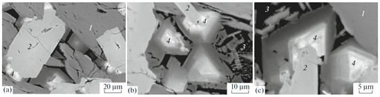 SEM images of the melted Synroc-type ceramic with model nuclear wastes: (1) hollandite, (2) zirconolite, (3) rutile and glass, (4) zoned murataite crystals overgrown on the zirconolite grains. (a) general view; (b,c) details with murataite–zirconolite intergrowths.