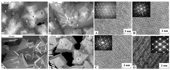 Left: SEM images of ceramics with 10% (a) UO2, (b) PuO2, (c,d) ThO2. (1) murataite 5C, (2) murataite 8C, (3) murataite 3C, (C) crichtonite, (T) pyrophanite; pores are black. Right: HRTEM micrographs of (A) pyrochlore, murataite (B) 3C, (C) 5C, (D) 8C taken with a high-resolution transmission electron microscope. Inserts: SAED patterns. Lines are atomic layers.