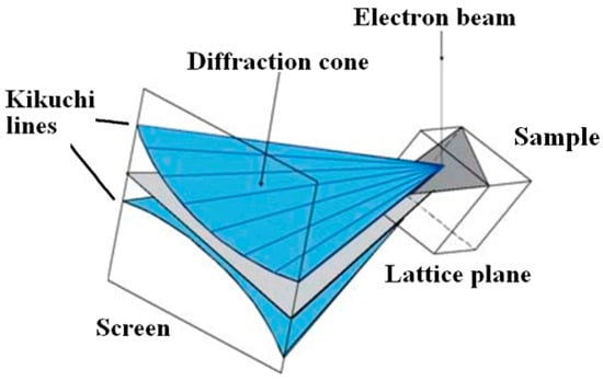 The EBSD method is based on the scattering of an incident electron beam in a sample, with the formation of a “point” source of electrons that coherently scatter and create a diffraction pattern which is recorded by a CCD detector. It presents a set of intersecting light stripes bounded by dark lines, called Kikuchi bands after the name of the scientist who first described this effect [135]. The method has been used in scanning electron microscopy since the 1970s [136,137]. To obtain EBSD patterns, the sample (Figure 6) is tilted at an angle of 70° which allows an increase in the proportion of electrons leaving the sample.