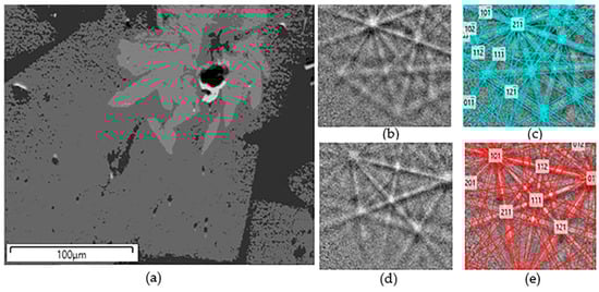 (a) SEM image of the analysed area, light—zirconolite, gray and dark-gray—murataite, and EBSD patterns of (b,c) zirconolite and (d,e) murataite, (b,d) before and (c,e) after indexing.