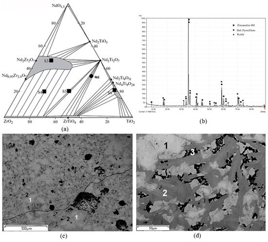 (a) Position of the “Nd” sample, (b) its X-ray diffraction pattern, and (c,d) SEM/EDS images: 1—pyrochlore, 2—zirconolite, 3—rutile (black) with fine pyrochlore inclusions. The scale bars on the SEM images are (c) 500 and (d) 50 µm. Markers on the XRD pattern show the peak positions only. The high-resolution diffraction pattern is given in Appendix B.