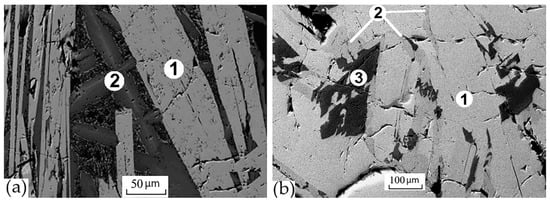 SEM images of the samples (a) MT: 1—monoclinic Nd2Ti2O7, 2—zirconolite; (b) RT: 1—orthorhombic Nd4Ti9O24, 2—zirconolite, 3—rutile.
