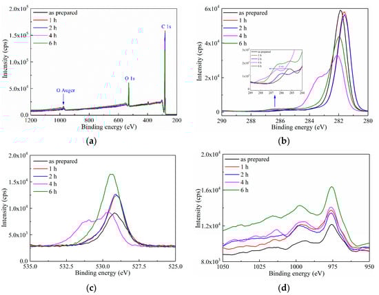 More detailed information is reported in Figure 1b,d. In Figure 1b of the C1s photoelectron spectroscopy, despite the barely changed intensity of C1s peak at 282 eV, a small peak was observed at 286.5 eV, which corresponds to C=O. A left shift of the C=O peak was observed in inset of Figure 1b, indicating the raising binding energy of C=O with the increased oxidation duration. Figure 1c is the O1s spectrum, showing a gradually enhanced peak intensity with the prolonged oxidation duration, which further indicates the growing absolute quantity of introduced O atoms, proving the surface modification of LDPE by ozone treatment. Figure 1d is the O auger peak, the trend of which shows a similar increase with that of O1s in Figure 1c.