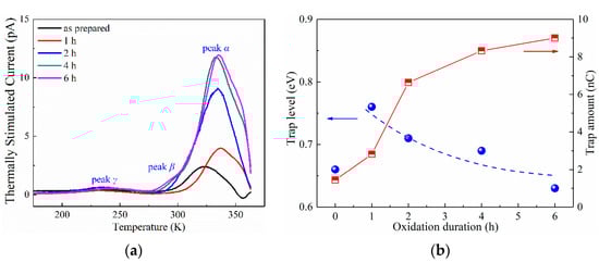 TSC spectra of as-prepared LDPE film and LDPE films with surface oxidation durations of 1–6 h. (a) TSC spectra in temperature range of 170–365 K; (b) The variations in trap level and trap amount with changes in surface oxidation duration, obtained from TSC results.
