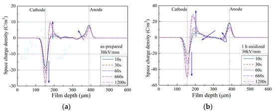 PEA experiments were conducted, and the result was compared with that of TSC. PEA is a common method for characterizing the space-charge behaviors of a dielectric material and the PEA results of the LDPE film after surface oxidation are shown in Figure 3.