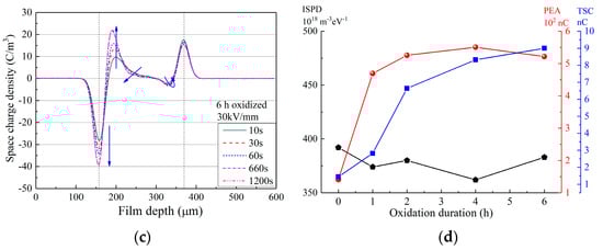 In Figure 3d, for the calculated total amount of space charges, both the TSC and PEA results show greatly enhanced space charge accumulation by surface oxidation, while the ISPD result shows a barely changed trap amount (data obtained from [44]). As ISPD applies non-electrode contact for space-charge injection, such an interesting result indicates that surface oxidation does not naturally change the bulk trap features of the dielectric films. However, surface treatment inevitably modulates the charge injection barrier between the electrode and the film surface. Thus, as both TSC and PEA apply electrode contact for space-charge injection, the quantities of accumulated charges increased tremendously after surface oxidation treatment.