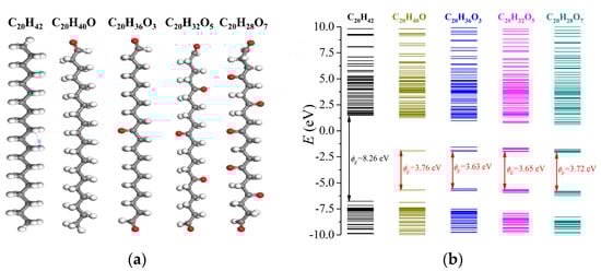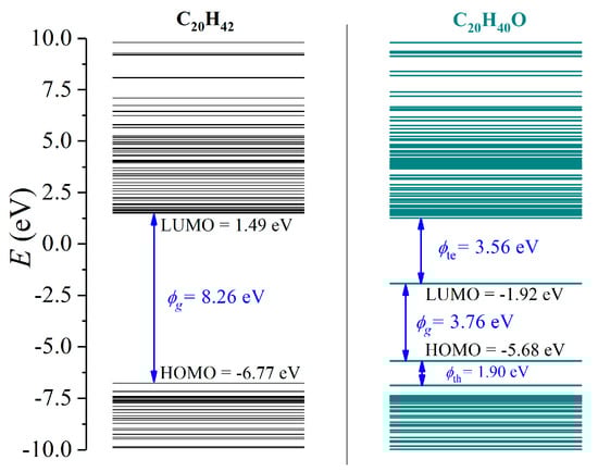 The energy level structures of C20H42 (LDPE with a polymerization index of 10) and C20H40O (LDPE with a one grafted O atom) were first investigated, as demonstrated in Figure 4. C20H42 exhibited the lowest unoccupied molecular orbital (LUMO) of 1.49 eV and a highest occupied molecular orbital (HOMO) of −6.77 eV, forming a bandgap (ϕg) of 8.26 eV, thus showing excellent electrical insulating characteristics. Oxidation lead to a lower LUMO of −1.92 eV with an increased HOMO of −5.68 eV. Meanwhile, charge trapping sites were formed near LUMO and HOMO, which exhibited ϕte = 3.56 eV for electrons and ϕth = 1.90 eV for holes. Apparently, the bandgap ϕg decreased to 3.76 eV, indicating substantially reduced insulating performance.