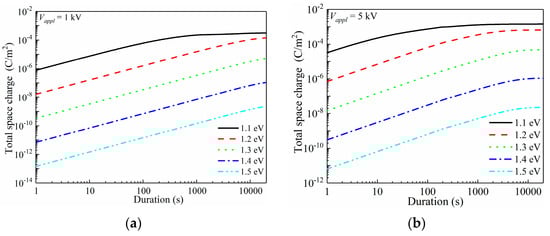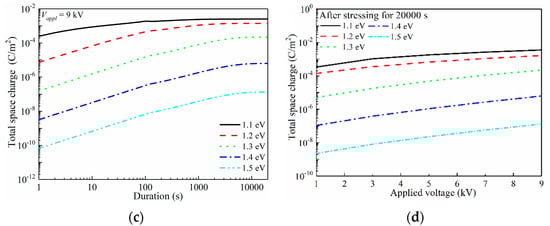 In the simulations, a 1–9 kV DC voltage was stressed onto a 100 μm thickness LDPE film for up to 20,000 s, and the electrode/polymer interfacial charge injection barrier was set as a variable in the range of 1.1–1.5 eV. A calculating grid of 200 was utilized, and thus the space charge distribution accuracy was controlled to 0.5 μm along the film depth direction. First, the total space charge (Nsp) with the variations in the charge injection barrier was investigated, as reported in Figure 7.