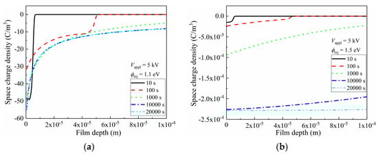 As is discussed in Figure 7, the charge accumulation was tremendously suppressed with high interfacial barriers. In Figure 8b, apparently, densities of space charges were exponentially smaller than those under the conditions of ϕinj = 1.1 eV, as only 10−4 C/m3 was reached. By increasing the voltage application duration, the space-charge density in vicinity of the left electrode continuously increased, with observable space-charge migration towards the right electrode.