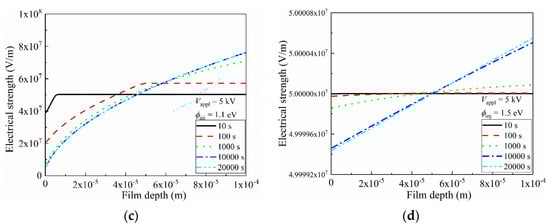 According to Poisson’s equation, less space-charge accumulation results in less distortion of the inner electric field along the film depth direction of LDPE [48], and the electrical field distributions corresponding to Figure 8a,b are shown in Figure 8c,d, respectively. As most of space charges were accumulated near the left electrode in Figure 8a, these homogeneous charges triggered an observable reduction in the electric field in the 10 μm vicinity of the electrode. This distortion became more violent with an enlarged accumulated space-charge density, and the drop of the electrical field even reached 1 × 107 V/m. Electrons started to accumulate near the right electrode when the voltage application duration exceeded 100 s, and these formed heterogeneous charges that elevated the corresponding electric field. After 1000 s, the electric strength near the right electrode reached 7 × 107 V/m, which exhibited a far-larger value of 5 × 107 V/m. Thus, the possibility of breakdown increased near the right electrode, and an applied voltage with a value of 2 kV/mm below the theoretical breakdown strength of LDPE could trigger a breakdown. Apparently, in terms of electric field distortion, the accumulation of space charges did not benefit the electrical insulating performance. Thus, such space-charge injection should be strictly prohibited, and one efficacious strategy is to increase the interfacial barrier height, as indicated in Figure 8d. In Figure 8d, although the electric field distribution profile was similar to that in Figure 8c, showing a decrease near the left electrode alongside an increase near the right electrode, the absolute value of the distorted electric stress was inhibited to 102 V/m. These results suggest that the space charge-induced electric field distortion could be systematically ignored when considering the issue of electrical breakdown.