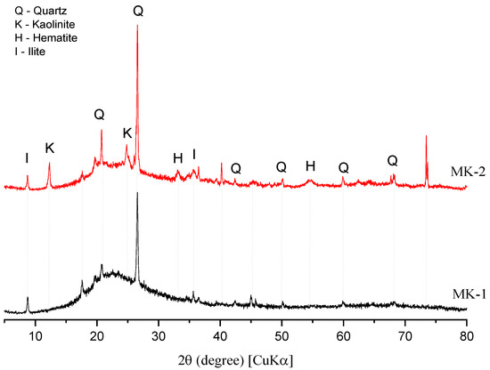 The X-ray spectra of both precursors (MK1 and MK2) are reported in Figure 1. The mineralogical analysis indicated kaolinite, hematite, and quartz. Moreover, MK2 is also composed by small amounts of illite. MK1 also showed a higher amorphous halo compared to MK2, which suggests a possible higher reactivity, as further discussed.