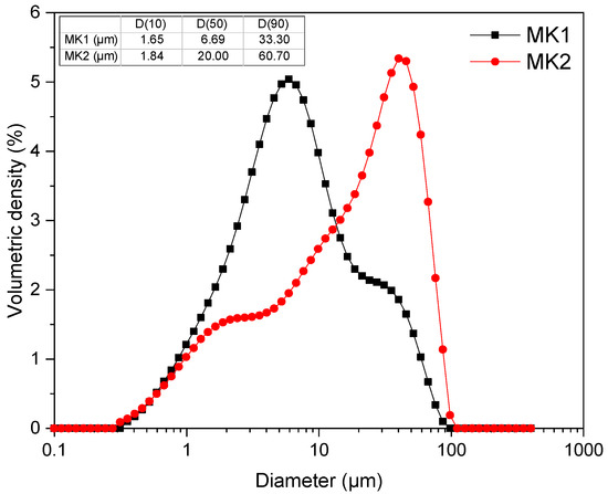 Particle size distribution was assessed using the 3500 Particle Size Analyzer (Microtrac, York, PA, USA), with a detection range of 0.1–3500 µm. The particle size distribution (PSD) of both materials is represented in Figure 3, and the specifications of D(10), D(50), and D(90) are indicated in the inserted table. Overall, MK2 has larger particles than MK1, with an average diameter of 20 µm.