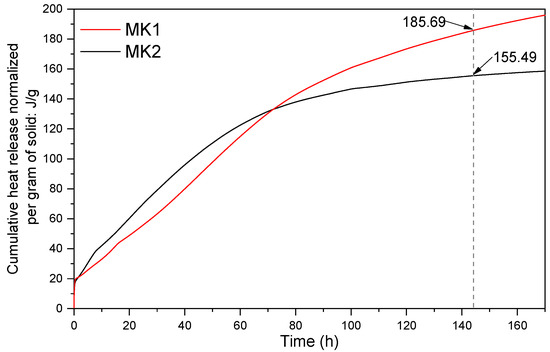 An approach to assess the reactivity of calcined clays is the method proposed by Avet et al. [37], designated as R3 test (rapid, relevant, and reliable test). This technique evaluates the reactivity of calcined clay as a function of the heat released after 144 h. Thus, the higher the heat released, the higher the reactivity. This method was adopted to indicate the reactivity of the two precursors evaluated in this study. Initially, the precursor was added to the standard solution, simulating the cement reactions environment. This solution is composed of potassium sulfate (K2SO4), calcium hydroxide [Ca(OH)2], potassium hydroxide (KOH), and water. After adding the precursor to the standard solution, the sample was put into an isothermal TAM Air calorimeter (TA Instruments, New Castle, DE, USA). The cumulative heat release was measured. Considering that the medium to be evaluated is the same for both systems, this technique becomes a comparative test. The results obtained in R3 test for MK1 and MK2 are registered in Figure 4 After 144 h, MK1 and MK2 showed a heat release of 185.69 J/g and 155.49 J/g, respectively. These results suggest a higher reactivity of MK1 compared to MK2. Furthermore, it was noted that during the initial period (0–60 h), MK2 was slightly more reactive than MK1, but it immediately got stability in its cumulative heat. In contrast, the heat released by MK1 continues to increase slowly and does not get stability until 170 h.