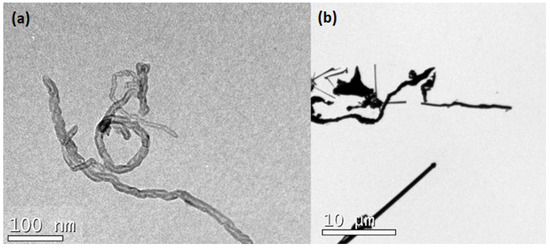 The geometry of SCW and CNTs were identified by transmission electron microscopy (TEM, JEM-1011, Joel, Akishima, Japan). The samples were dispersed in water, deposited under a carbon grid, and air-dried until the analysis. Figure 5 shows the irregular shape of nanomaterials. Moreover, note the order of magnitude of the image scales; while CNT has a nanometric scale, SCW has a micrometric scale.