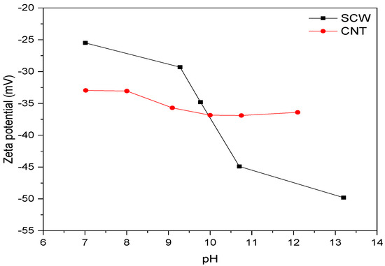 The zeta potential of CNT and SCW aqueous dispersions (concentration of 0.01 wt.%) was measured at a temperature of 25 °C with a pH range of 6 to 12 in a Zetasizer Nano (Malvern, UK), with a measuring range of 3.8 nm to 100 µm. The dispersions were prepared by sonication (see conditions in item 2.4). The pH was adjusted with hydrochloric acid and sodium hydroxide solutions.