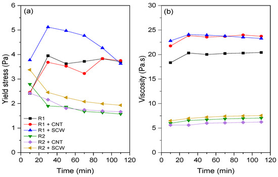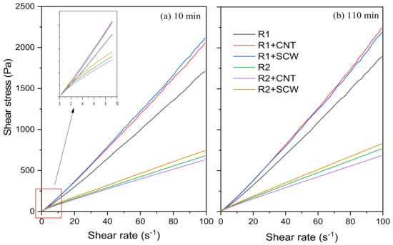 The fresh state of geopolymer pastes was assessed through rotational rheometry. Figure 8 shows the shear stress vs. shear rate curves of the compositions evaluated after 10 and 110 min of the contact of the precursor with the A.S. to exemplify the rheological behavior of metakaolin-based geopolymers. Pastes based on MK1 (R1, R1 + CNT, and R1 + SCW) were more viscous and difficult to spread than those made with MK2 (R2, R2 + CNT, R2 + SCW). R1 group and its derivatives have a shear stress range between 1.70–2.11 Pa, after 10 min. This group registered a slight increase of 11% after 110 min for R1 geopolymer, while the compositions incorporating CNT and SCW increased 9.30% and 3.49%, respectively. In contrast, the R2 group and its derivatives have a lower shear stress range, values between 630 and 741 Pa, 60.21% less than the R1 groups. This trend will be further discussed.