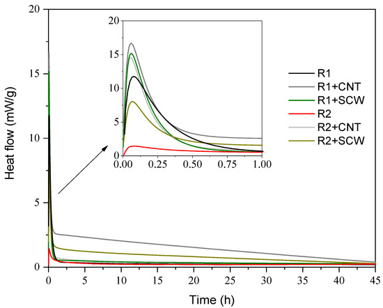 Figure 10 shows the heat flow and the cumulative heat for all groups. There are few discussions concerning a matrix exclusively based on MK and with the addition of nanomaterials. Nevertheless, the behavior of the heat flow curve is consistent with the literature: systems based on MK with higher Ms (SiO2/Na2O) of A.S. do not develop a second peak at during the next 42 h [58,59,60], and groups without nanomaterials get thermal stability closed to 10 h after samples preparations. A single exothermic peak is observed for all evaluated systems, mainly associated with the wetting and dissolution of the precursor on A.S. [61,62]. R1-based groups indicate greater intensity in heat flow, which is related to the reactivity of MK1 being greater than MK2. However, the surface energy added to the system by introducing nanoparticles cannot be ignored, which also changes the focal points of the dissolution process.