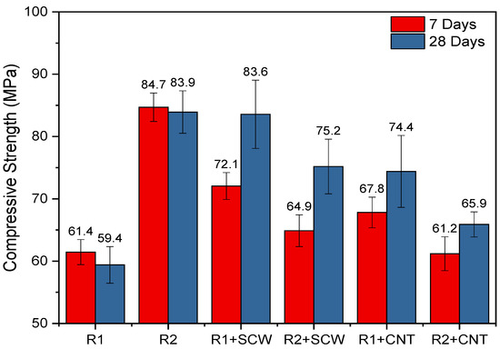 The R1 and R2 systems containing SCW and CNT registered different performances. As shown in Figure 11, the SCW and CNT incorporation cause positive effects (increase) exclusively on R1- based groups, while for R2-based groups, all addition causes reductions in compressive strength. For the 28 days, the highest increment reached 40.7%, with SCW addition. In the R2-based group, the additions lead to a drop in strength, which allows us to infer that this matrix may have reached the best performance without nanomaterial incorporation. Its presence ended up harming the continuity of the matrix, which promotes significant reductions, up to 27.76% when CNTs are added or up to 23.39% when SCWs are added, from the first 7 days.