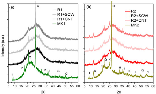 XRD spectrum of groups based on: (a) MK1; (b) MK2. Specifications: I—Ilite, K—kaolinite, Q—quartz, and H—hematite.