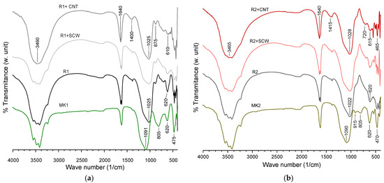 FTIR Spectrum of mixtures at 28 days: (a) MK1-based groups, (b) MK2-based groups.