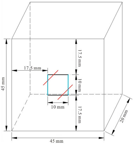 Rock samples in the following tests were all taken from the Sanshandao gold mine, China. Granite with good integrity and homogeneity was used; with a density of 2580 kg/m3; an elastic modulus of 9.86 GPa; and a uniaxial compressive strength (UCS) of 139.66 MPa. A series of core slices were identified using optical microscopy. The rock sample composition is approximately 34% plagioclase, 27% potassium feldspar, 30% granular quartz, and 6% flaky biotite; and accessory minerals, such as calcite, white mica, and brown epidote, and so on, as shown in Figure 1 [17,18]. Rock cores were processed into cuboid samples, with a size of 45 mm × 45 mm × 20 mm (length × height × thickness), were divided into complete samples and crack samples with double parallel joints. A cutting machine was used to precast cracks in the granite specimens. The length of the fractures was 10 mm and the width was 1 mm, as shown in Figure 2. The specimens(University of South China, Hengyang, China) with cracks included three different inclination angles, which were 0°, 45°, and 90°, respectively.