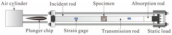 In this experiment, the SHPB device(Central South University, Changsha, China) was used to simulate the mechanical behavior of the specimens; with parallel double cracks under simultaneous dynamic and static loading. The SHPB device is mainly composed of three parts, namely the power drive system; the pressure rod system; and the data collection system, as shown in Figure 3 [19]. The pressure rod system includes an incident rod, a transmission rod, and an absorption rod. The specimen was placed between the incident rod and the transmitted rod; and the impact process was realized using air pressure to accelerate the warhead. Two sets of strain gauges were attached to the incident and transmitted rods to record the strain. In order to achieve the purpose of the constant strain rate loading, the spindle punch was used to realize the half-sine wave loading. Meanwhile, the system was equipped with an ultra-dynamic strain gauge and oscilloscope; this can realize the acquisition and record the stress wave signal and data processing. Based on the one-dimensional stress wave theory, the average dynamic stress, strain, and strain rate of the sample can be calculated by the following formula [20]: