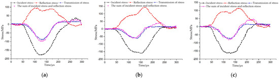 In order to ensure the correctness of the SHPB test results, dynamic stress balance had to be reached at both sides of the sample before rock failure under the dynamic load. The stress equilibrium curves of the SB-flaw specimens were taken as examples. As shown in Figure 4, the superposition wave of the incident wave and reflected wave was basically consistent with the transmitted wave, especially the section before the peak; this indicates that the rock sample reached the stress equilibrium state during the loading period. In the deformation process of the rock samples, the assumption of the stress balance condition was satisfied; moreover, the improved SHPB device was consistent with the one-dimensional stress wave transfer characteristics, which can effectively eliminate the wave dispersion and inertia effects. Thus, this proves the validity of the test results.