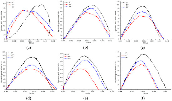 Dynamic stress–strain curves of different inclination angles under static axial compression: (a) 0 MPa; (b) 10% UCS; (c) 20% UCS; (d) 30% UCS; (e) 50% UCS; and (f) 60% UCS.