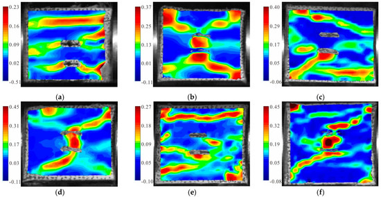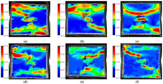 Maximum principal strain cloud diagram of the granite specimens with 45° cracks: (a) S0-flaw 45°; (b) SA-flaw 45°; (c) SB-flaw 45°; (d) SC-flaw 45°; (e) SD-flaw 45°; and (f) SE-flaw 45°.
