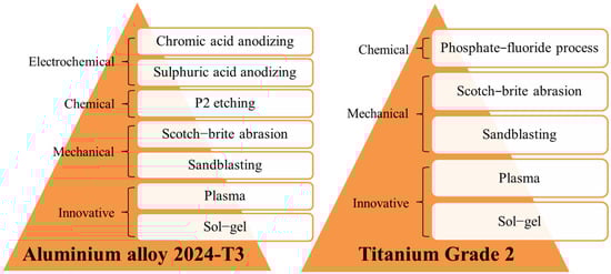 Two types of materials, aluminium alloy 2024-T3 and titanium Grade 2, were used to compare different surface treatments. Aluminium and titanium were prepared using mechanical, chemical, electrochemical, and other innovative types of surface treatments, including sol-gel and plasma. Figure 1 presents all surface treatments used during the investigation.