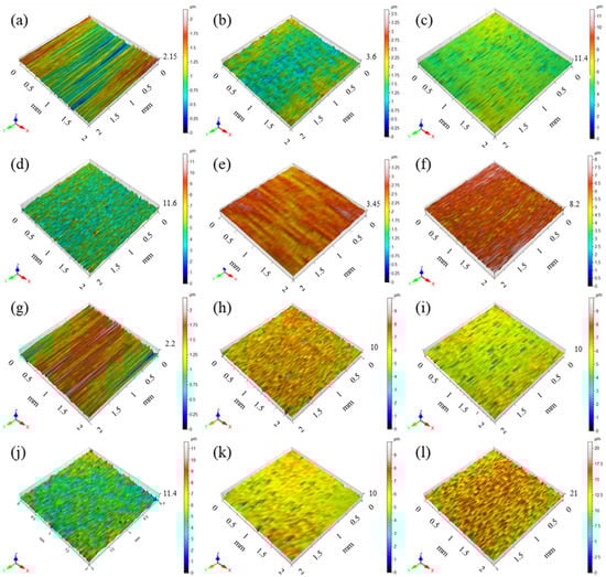 The 3D roughness profiles for aluminium alloy: delivery state (a), Scotch-Brite abrasion (b), chromic acid anodizing (c), sandblasting (d), P2 etching (e), sulphuric acid anodizing (f), plasma (g), and titanium: delivery state (h), Scotch-Brite abrasion (i), phosphate-fluoride process (j), plasma (k), sandblasting (l).