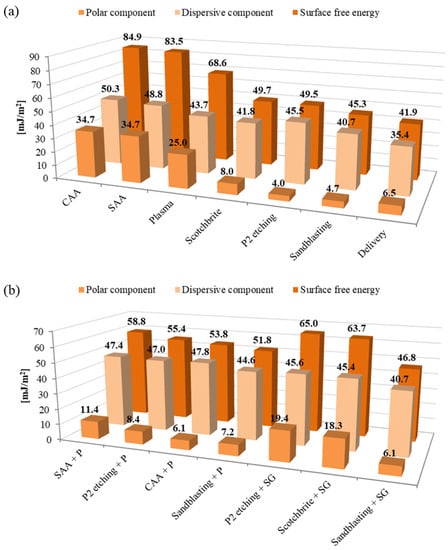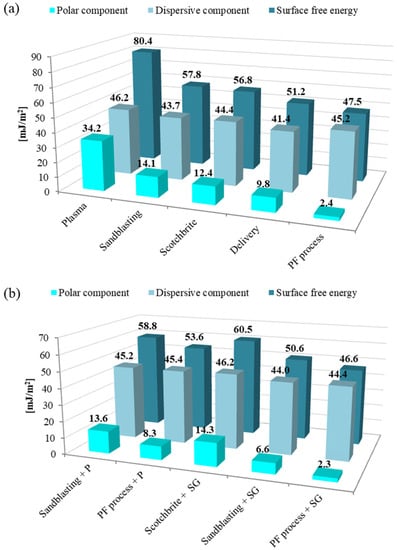 In the case of the sol-gel coating, its influence on the physicochemical properties of the surface was noted. It was observed that the surface with sol-gel coating after P2 etching and after Scotch-Brite abrasion results in the and at the same level (see Figure 4b and Figure 5b). This indicates that due to the use of the sol-gel coating, it will be possible to obtain a surface capable of forming strong chemical bonds with the epoxy resin of the composite, which confirms [38,39,41]. This is different after sandblasting of aluminium and titanium, or also after phosphate-fluoride process, because the values of the surface-free energy, or the polar component, are at a much lower level. According to the authors of this study, it may be related to the surface topography and the possibility of penetration of unevenness and covering the unevenness with a thin sol-gel layer. Authors [46] showed that the decrease in the SFE is connected with the increase in the surface roughness due to ridges, asperities, and peaks restricting the spread of a droplet, thus the primer is not able to fully cover the surface. The above considerations will be developed in more detail in the next chapter about metal surface structure depending on the different surface treatment methods.