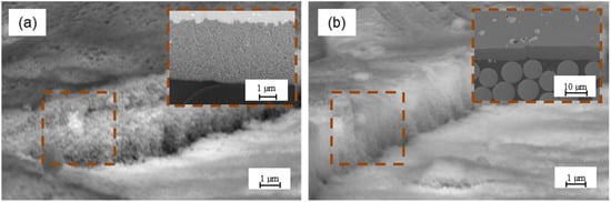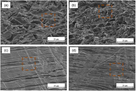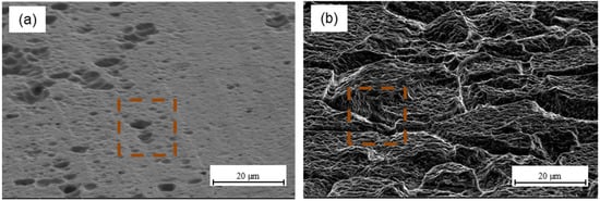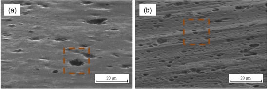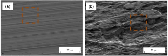 Mechanical methods are commonly used in the metal surface treatment for bonding. According to the theory of mechanical adhesion, surface irregularities allow mechanical interlocking for increasing adhesion at the metal–composite interface. Mechanical interlocking occurs when the adhesive can penetrate the surface irregularities, and it becomes mechanically blocked with the substrate [49]. Literature data show that a rougher surface is desirable due to the fact that provides a stronger internal adhesion, which is associated with an increase in surface energy and guarantees an effective contact at the metal–composite interface, which in turn activates the mechanical keying mechanism [13,50]. At the same time, a necessary condition is the production of a certain shape of irregularities that will be capable to hold the adhesive [23]. It is possible due to the appropriate surface roughness as a result of the mechanical methods. An increase in the total surface enables more reactions between the metal and the adhesive. However, based on the other authors’ results, it seems that in the case of sandblasting, when a certain roughness is exceeded, shear strength decreases because of roughness being too high, which blocks the effective ingress of the resin, causing it to settle on the peaks [51,52,53]. Optimum surface roughness allows obtaining high adhesion [52]. Figure 7 presents the morphology of aluminium (Figure 7a) and titanium surface (Figure 7b) after plasma treatment.