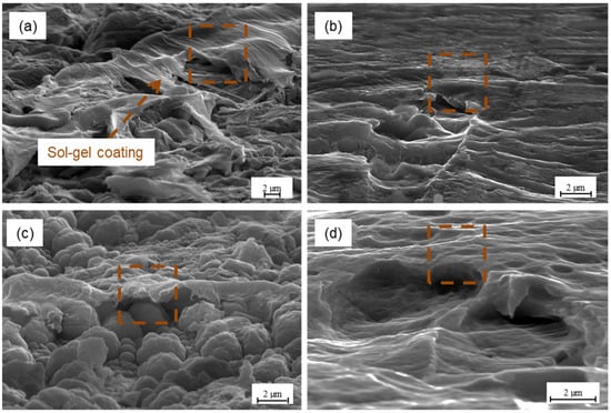 The use of a sol-gel coating may have a positive effect on the specificity of the surface. By filling its unevenness and porosity with a thin layer, from the point of view of adhesion at the boundary of the separation. Providing the possibility of obtaining a hybrid mechanical-chemical connection. The sol-gel has been noted to soak into the surface leaving a thin layer as opposed to the primer layer (see Figure 13).