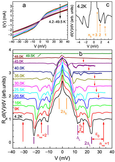 - Kuzmicheva, T.E.; Kuzmichev, S.A.; Mikheev, M.G.; Ponomarev, Y.G.; Tchesnokov, S.N.; Eltsev, Y.F.; Pudalov, V.M.; Pervakov, K.S.; Sadakov, A.V.; Usoltsev, A.S.; et al. Experimental study of the intrinsic multiple Andreev reflections effect in GdO(F)FeAs superconductor array junctions. EPL (Europhys. Lett.) 2013, 102, 67006. [Google Scholar] [CrossRef][Green Version]