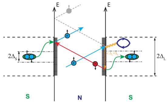 Scheme of the multiple Andreev scattering where electron from the normal metal (N) within the proximity range near the superconductor (S) can scatter on the spin exciton (shown as the electron-hole bubble), lose energy , and then form a Cooper pair inside the superconductor. Andreev reflected hole travels to the other side of the normal metal and, by annihilating with one electron from a Cooper pair of the left-hand side superconductor, results in the reflection of the electron.