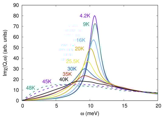 The possibility left open is the scattering on the spin exciton that is formed in the superconductor. The process is sketched in Figure 3. Within the random phase approximation (RPA), the energy of the spin exciton is calculated as a position of the spin resonance peak. Later it appears as a true divergence of the RPA spin susceptibility in the superconducting state with the gap [3,4]. Iron-based materials are one of the interesting examples where RPA results for the pairing agree quite well with the more sophisticated theories. Later includes analytical (logarithmic) renormalization group (RG) [33,34,35,36], functional renormalization group (fRG) [37,38,39,40,41], and DFT+DMFT approach [42]. The origin of this agreement was extensively discussed earlier [43,44,45]. Taking into account that the electron–phonon interaction seems to be weak in pnictides [46], this leads to the conclusion that the RPA in application to the multiband Hubbard model provides a quite reasonable approach to the physics of iron-based materials [47]. We have calculated the temperature dependence of the spin susceptibility within the five-orbital model for pnictides [48] using the measured values of the gaps as input parameters. Small gap anisotropy on the electron Fermi surface sheets was introduced similar to Ref. [49]. Depending on the set of on-site Coulomb interaction parameters, namely, Hubbard repulsion U, interorbital repulsion , Hund’s J, and pair hopping , the peak slightly shifts in frequency and its width changes. The result for eV, eV, and eV is shown in Figure 4. Positions of the maxima form the dependence that is plotted in Figure 2. Since, with the increasing temperature, the peaks become broader and their amplitudes diminish, the uncertainty in the spin exciton frequency increases.
