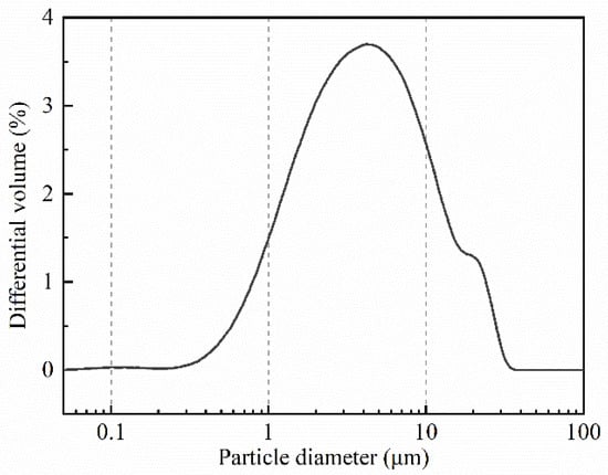Metakaolin-based geopolymer (MKG) samples were prepared by mixing metakaolin and alkaline activator. The industrial Metamax® metakaolin (MK) was obtained from BASF SE (Ludwigshafen, Germany). The metakaolin powder was characterized by X-ray fluorescence analysis (XRF-1800), and its chemical composition can be seen in Table 1. Figure 1 depicts the particle size distributions of MK, and the average diameter of MK powders is 5.91 μm. The alkaline activator was obtained by mixing water glass (WG), sodium hydroxide (NaOH), and extra water. The modulus (M = n(SiO2)/n(Na2O)) of water glass is 3.28, and its chemical compositions are shown in Table 2. The sodium hydroxide was in flake form (CP, 98% purity). For extra water, deionized water was used in samples for inductively coupled plasma optical emission spectrometer (ICP-OES) detection, and tap water was used in other samples. The above four raw materials (MK, WG, NaOH, and extra water) were mixed together with the designed ratios as follows: n(SiO2)/n(Al2O3) = 4, n(Na2O)/n(Al2O3) = 1, and the water/binder ratio ranged from 0.6 to 0.8. The water/binder ratio is calculated by Equation (1).