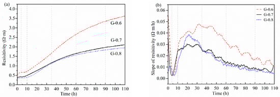 The detection of non-contact resistivity started from the time point when raw materials were mixed with the alkaline activator. As shown in Figure 2a and Figure 3, the resistivity of all three samples showed a growing trend. The growing trend was consistent with the polymerization and accumulation of the solid phase [28,29]. The slope of resistivity dropped sharply in the first 4 h, then rose quickly in 4–10 h (Figure 2b). After that, the increase slowed down and reached a plateau at about 15–30 h. From about 40 h, the slope gradually decreased. The plateau and decrease in slope correspond to linear and logarithmic increases in resistivity, respectively, demonstrating two distinct modes of polymerization and accumulation.