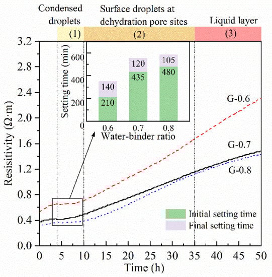 The initial and final setting times of MKG with different water/binder ratios were measured by referring to cement paste (Figure 3). Thus, the solidification of these samples mainly occurs at 3.5–9.75 h, which is only in the plateau phase of resistivity. The smaller the water/binder ratio, the earlier the initial setting starts. The intervals between the initial and final settings for these three samples are 140 min, 120 min, and 105 min, respectively. Therefore, if the water/binder ratio is larger, MKG needs less time from the initial to final setting.