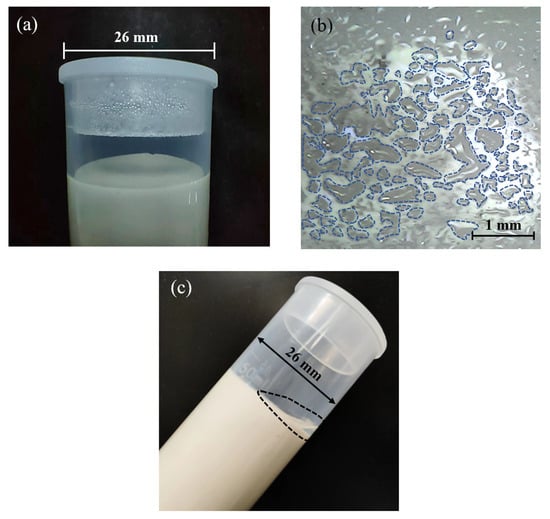 MKG pastes with water/binder ratios of 0.6–0.8 were continuously observed, and significant dehydration phenomena could be observed in 4–50 h (Figure 3). The dehydration time and performance of different samples are similar. Dehydration can be roughly divided into the following three stages. In the period of 4–10 h, condensed water droplets appeared on the top and inner walls of the test tubes, and more droplets condensed in samples with higher water/binder ratios (Figure 6a). In the period of 10–35 h, the amount and size of condensed water droplets remained unaltered, but many water droplets were produced at the surface of the samples. Droplets gradually grew larger and then connected to the liquid circle or liquid layer (Figure 6b). During 35–50 h, the liquid layer gradually became thicker (Figure 6c).
