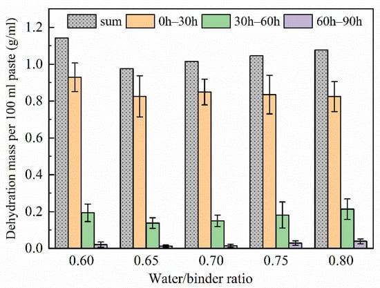 The gravimetric test results of dehydration could give a clearer demonstration of the total dehydration mass and periodical dehydration speed (Figure 7). Because early dehydration occurs for small liquid droplets, and they are difficult to collect and weigh, the interval of two measurements was set as 30 h. MKG samples of different water/binder ratios had a similar water loss in each stage. The water collected within 0–30 h mainly condensed droplets on the inner wall and partly from separated droplets on the sample surface. More than 90% of the cumulative heat release of MKG happened in 0–24 h [48]. Thus, the main reason for dehydration in this stage is heating release.