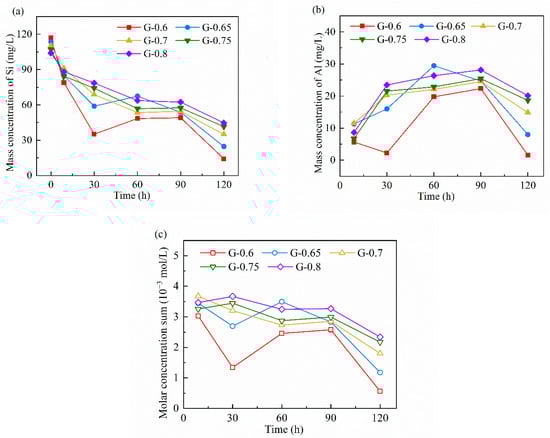 Ionic concentration evolution of Si (a) and Al (b) by mass concentration and their sum by molar concentration (c) during 0–120 h.
