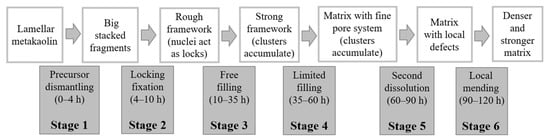 The evolution of the ionic concentration reveals two distinct ion consumption stages. The first stage happens before 60 h, and the other one is after 90 h. There are also two distinct ionic dissolution equilibrium stages before 9 h and at 60–90 h. Those two dissolution equilibriums provide suitable polymerization conditions for subsequent consumption stages, respectively. However, the first one happens in an abundant water environment before solidification, and the second one happens in pore water after solidification and dehydration. Considering the spatial filling rule and two dissolution equilibriums, the physical and chemical changes that occur in the early geopolymerization can be expounded into six stages, as described below (Figure 9).