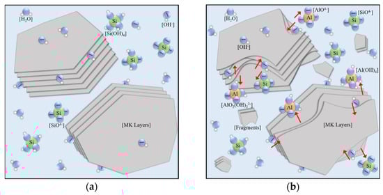- Precursor dismantling (0–4 h). Aluminosilicate precursors are dispersed into the water environment. Firstly, the aluminate sites in Al2O3·2SiO2 layers quickly dissolve (Figure 10a), causing lamellar metakaolin to tear apart from those sites into fragments [53]. The wildly stacked fragments show chemical shrinkage and block the transmission of oligomers to improve resistivity. The dissolved aluminate monomers that randomly distribute in liquid or lie on the fragments’ surface act as central trigger sites. Much silicate monomers from water glass are consumed for initial polymerization (Figure 10b) [22,34,54].