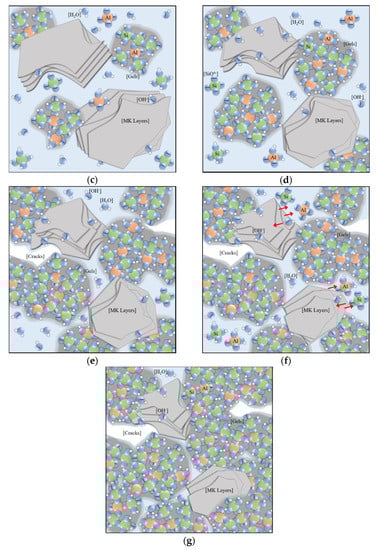 The gel filling effect starts as early as the final setting, especially in MKG with low water content. Based on rapid setting and subsequent self-desiccation, the geopolymerization process is supposed to follow spatially filling rules, i.e., growing nuclei link dissolved fragments into the aluminosilicate framework. Subsequently, nuclei grow into dense gel clusters to fill the spaces in the framework.